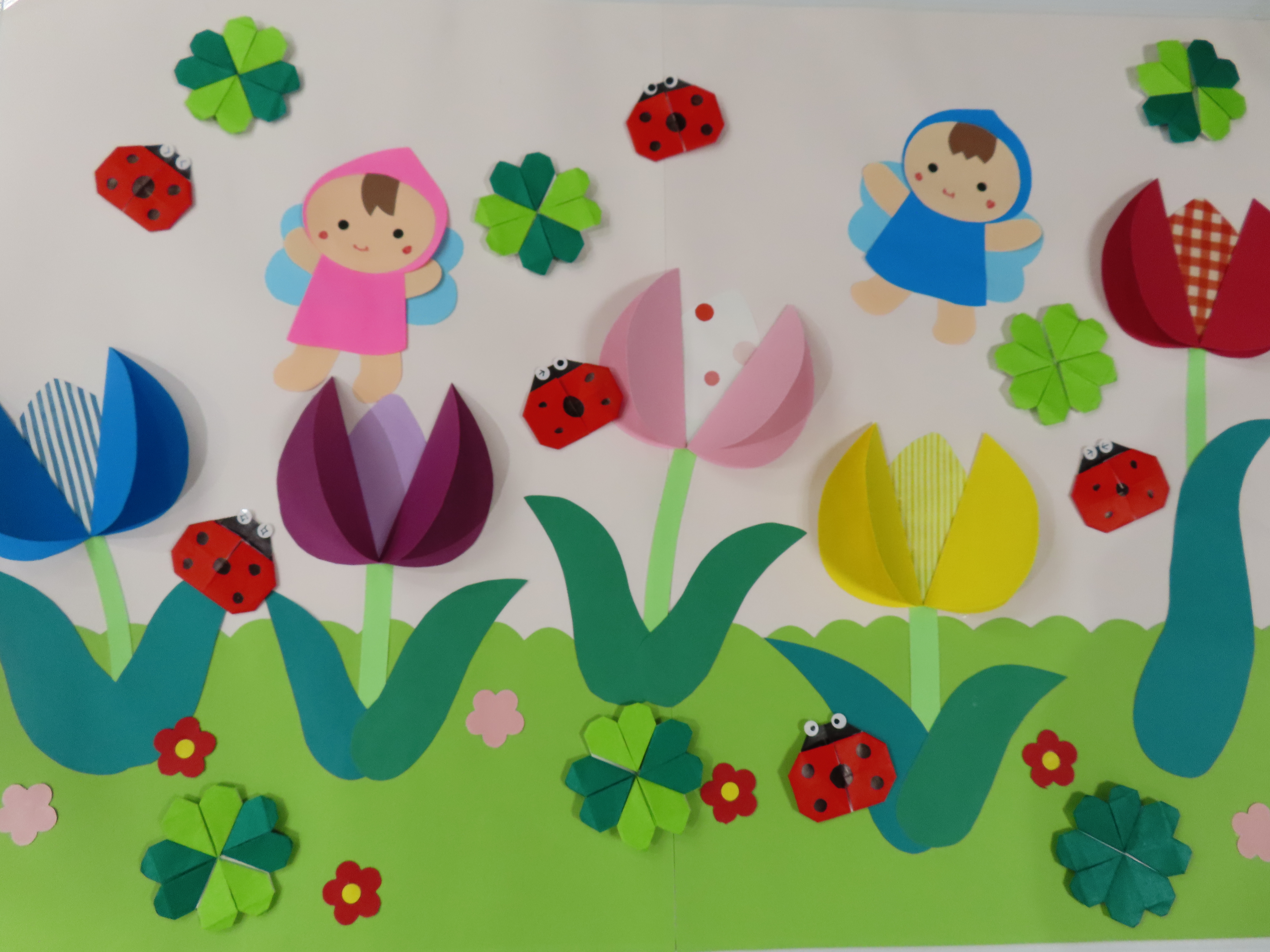 児童館の玄関には、四季ごとに子どもたちが折った素敵な壁面が飾られています。