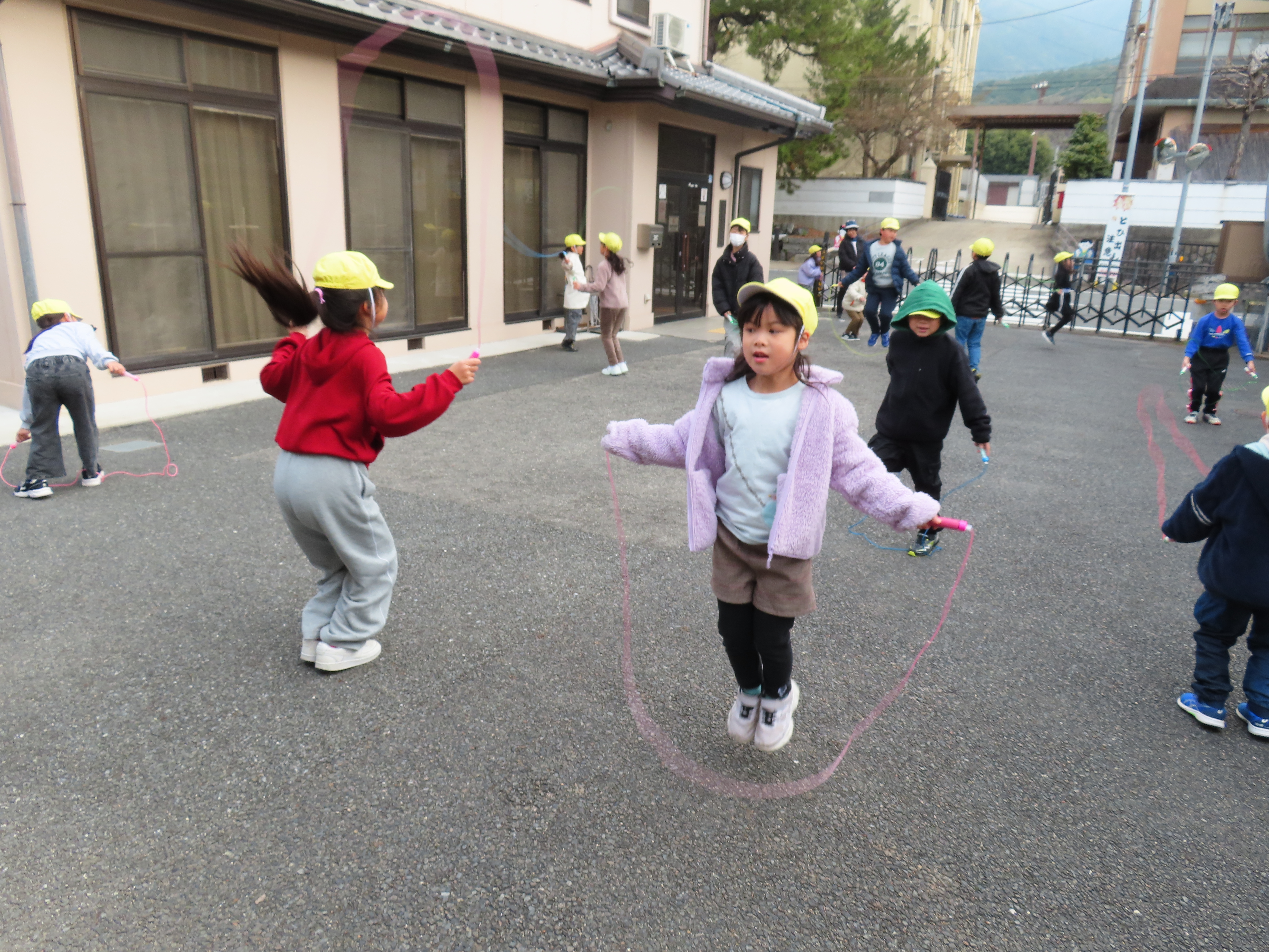 準備運動をし、前跳びの回数を増やしたり、二重とびや交差とびにチャレンジしています。寒いですが、すぐにぽかぽか体があたたまります!