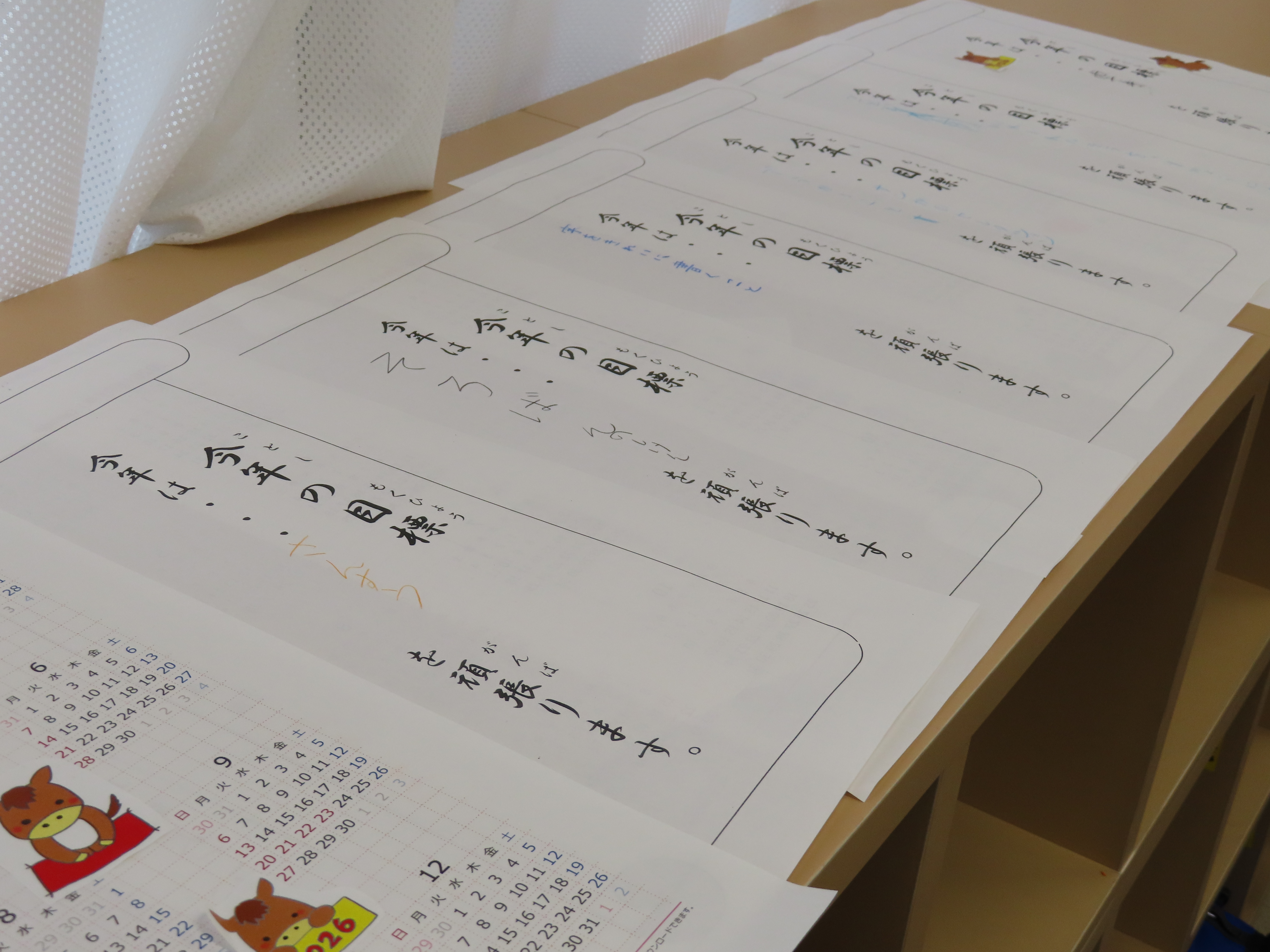 1月は、2026年のカレンダーづくりをしました。干支の「午」やオリジナルのイラストをかいて、裏には今年の目標を書きました。