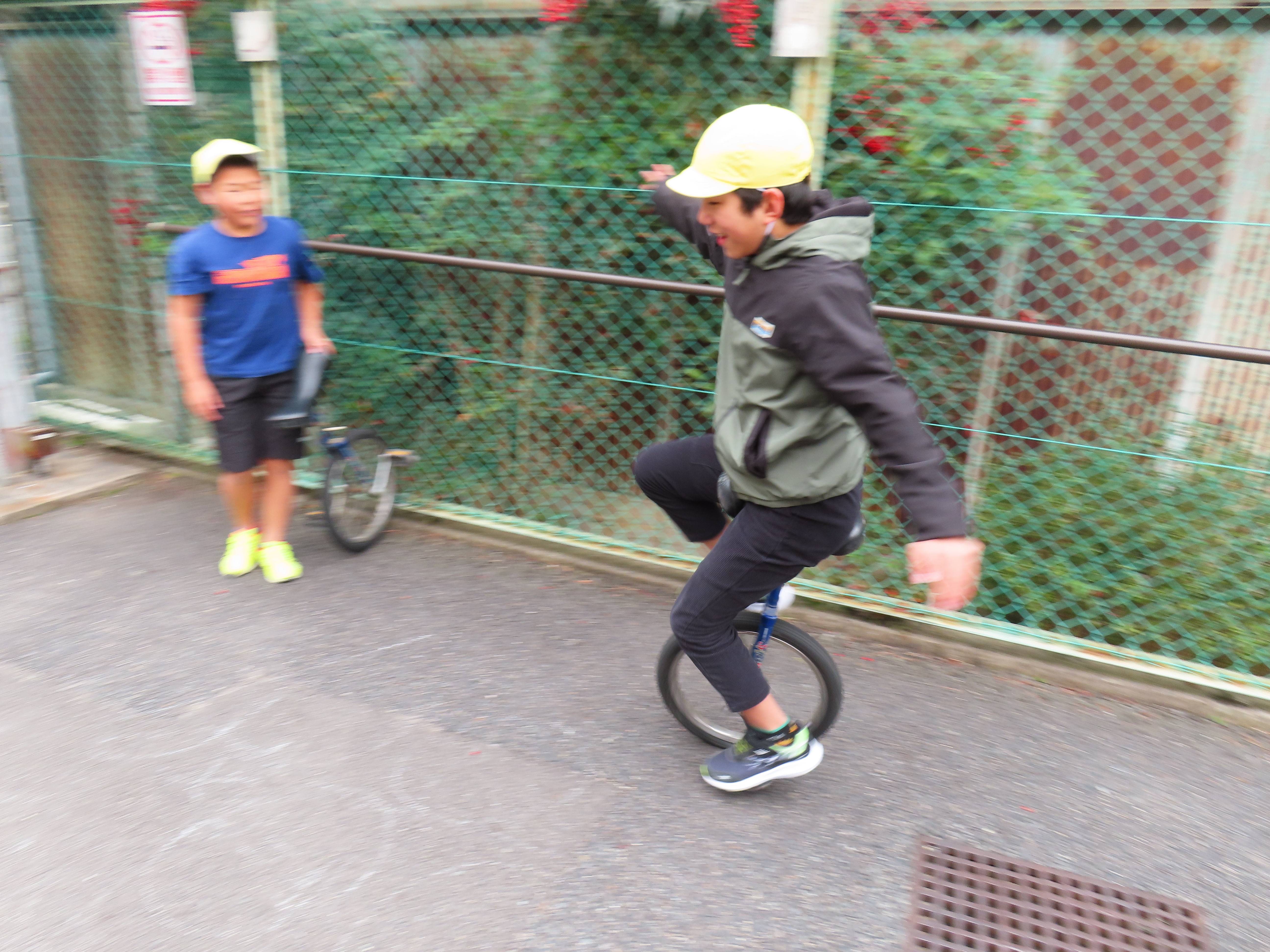 最初は一輪車にまたがるだけでも必死だった1年生も、徐々に横移動の練習をしています。